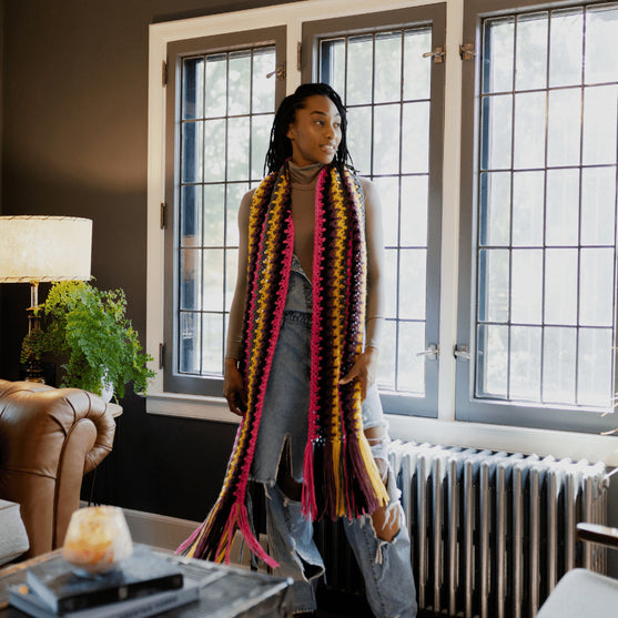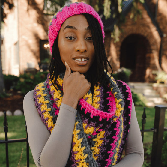 Winter is no match for the wooly warmth of the Metro Hat and Scarf set. Both pieces use an addictive spike stitch pattern that allows the vibrant color palette to shine. Thoughtful finishing touches like a fuzzy faux-fur pom pom and playful fringe ensure you’ll stand out among the crowd.